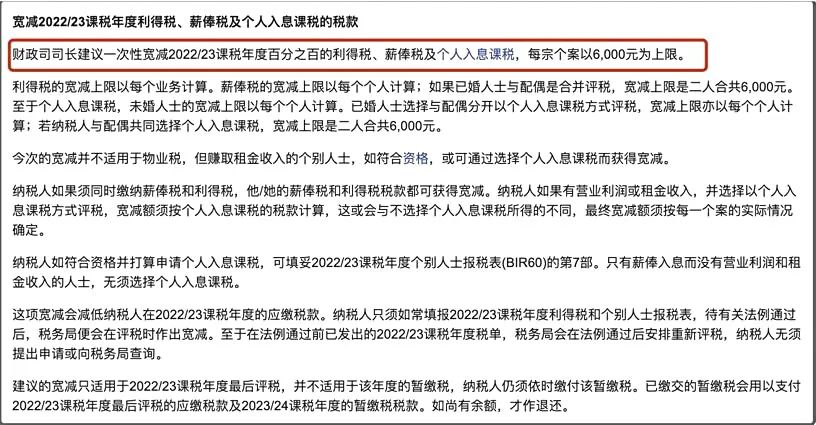 2、宽减2022/2023课税年度百分之百的薪俸税和个人入息课税,上限为6000港币。