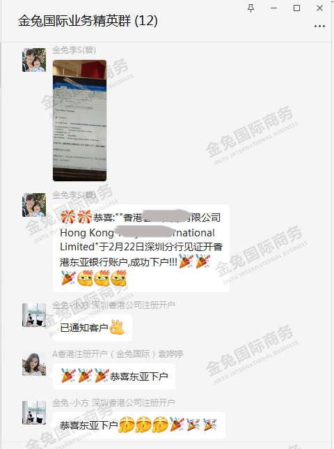 恭喜:””香港XY國際有限公司Hong Kong Y**** International Limited”于2月22日深圳分行见证开香港东亚银行账户,成功下户!!!